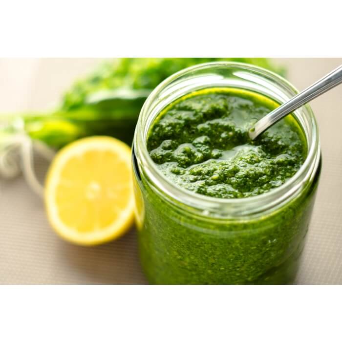 - Agregue el jugo de limón y el Saborizante Concentrado de Albahaca Monin y vuelva a pulsar. Con la cuchilla en funcionamiento, agregue lentamente el aceite de oliva hasta que el pesto se mezcle de manera uniforme.