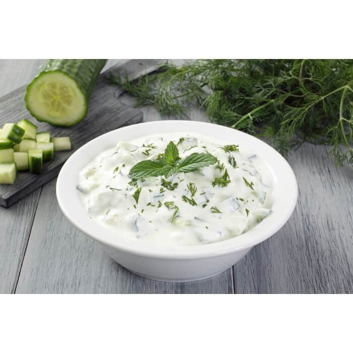 - 2 tazas de yogur griego 18 ml (6 dosificaciones) de Saborizante Concentrado de Pepino 1 cucharada de jugo de limón fresco 1 cucharadita de ajo picado 1 cucharadita de eneldo fresco