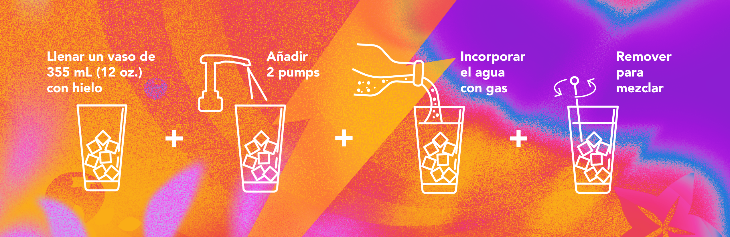 Disponibles en 5 tonos eléctricos y 3 opciones sin azúcar, cada porción de 30 ml (1 oz. o 2 bombas) proporciona 80 mg de cafeína natural para una deliciosa recarga de energía.