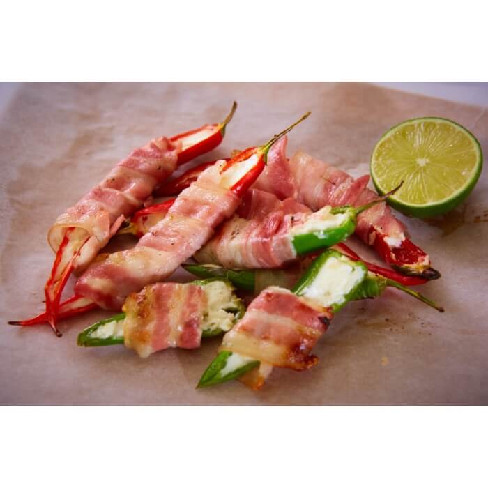 Botanas de jalapeño y frambuesa envueltas en tocino