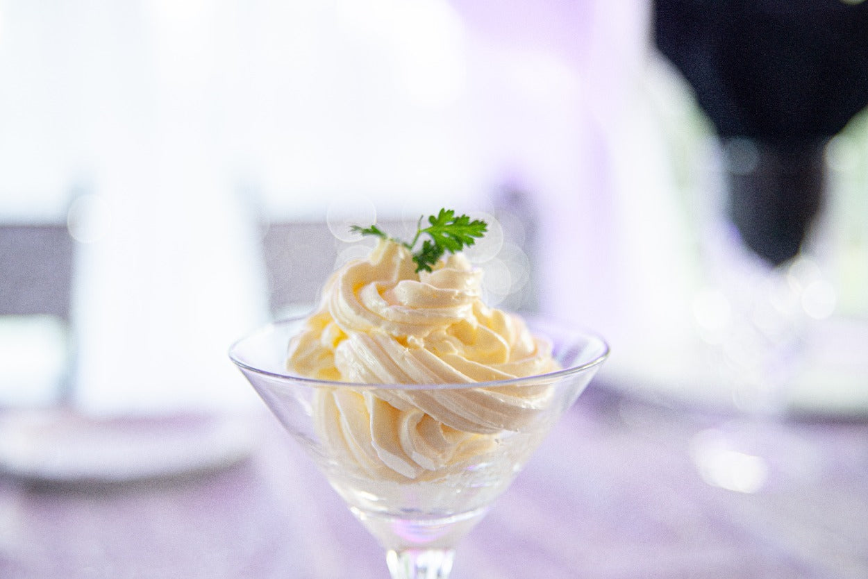 - Una vez que la crema espese y comience a reposar, agregue lentamente el sabor concentrado de albahaca hasta que esté completamente incorporado.